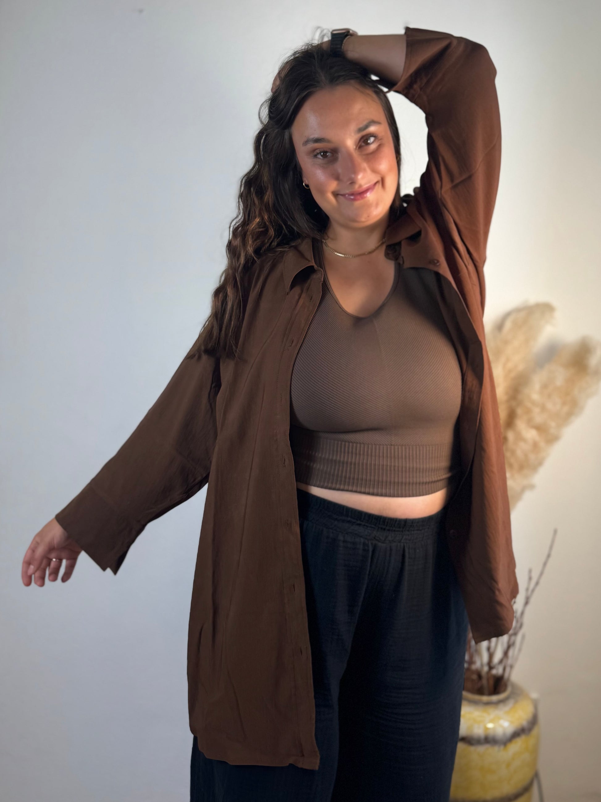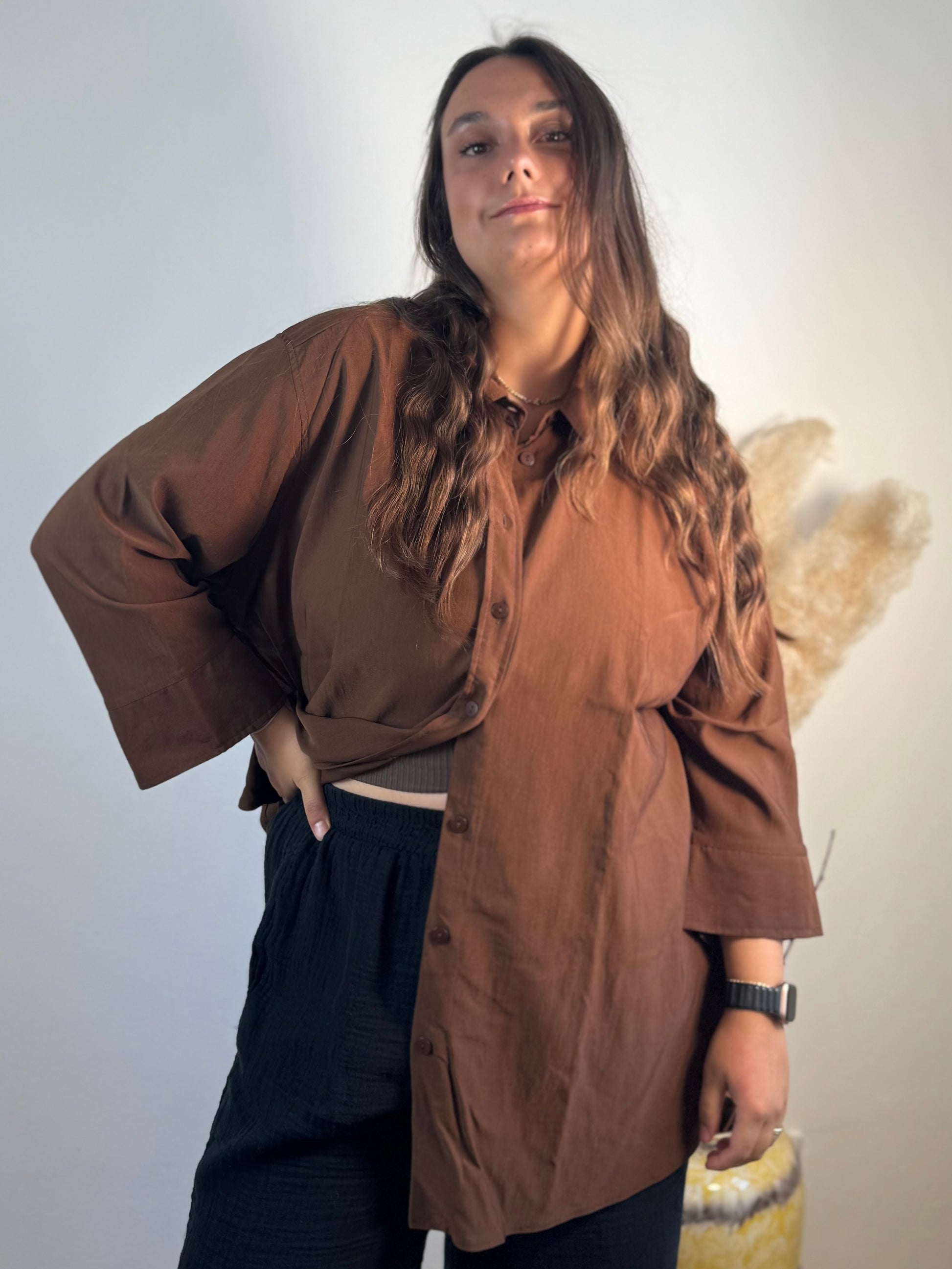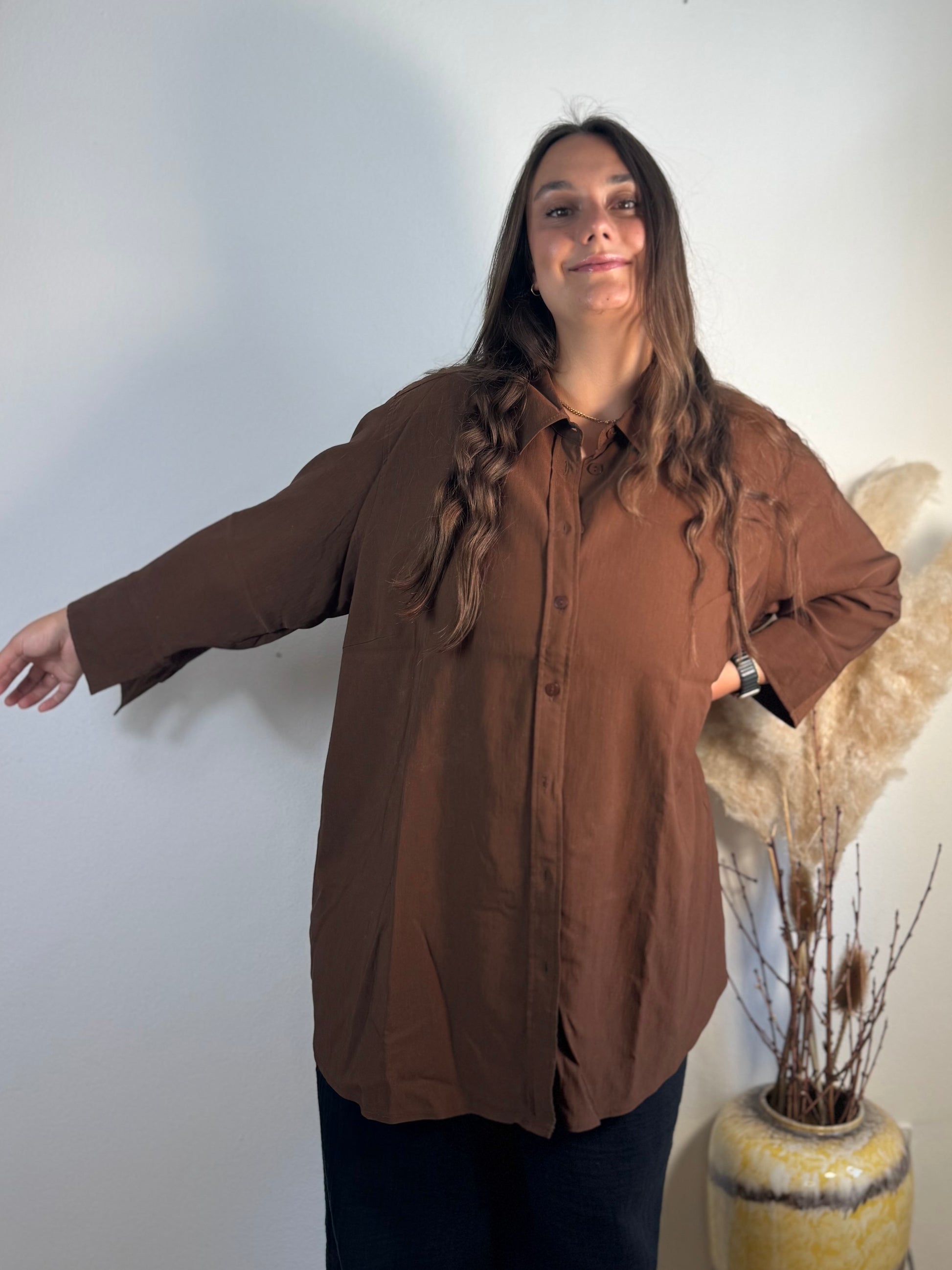Diese braune Bluse ist ein absolutes Must-Have für jeden Kleiderschrank. Mit ihrem Oversize-Schnitt bietet sie nicht nur einen stylischen Look, sondern auch ultimativen Tragekomfort. Perfekt für alle, die ihren individuellen Stil unterstreichen möchten.