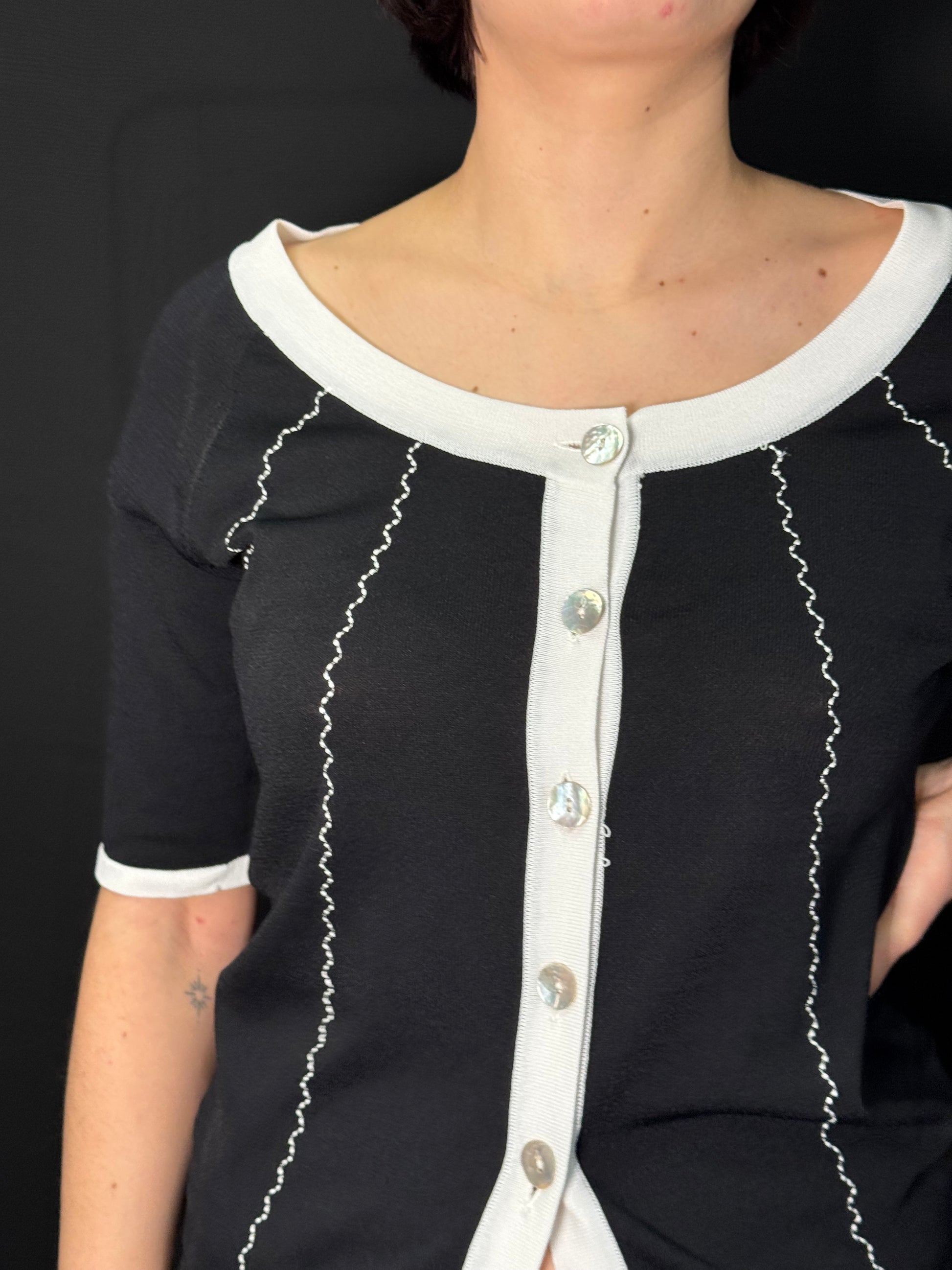 Dieser Kurzarmcardigan in Schwarz-Weiß bietet vielseitige Kombinationen für jede Jahreszeit. Die hochwertigen Materialien gewährleisten sowohl Komfort als auch Langlebigkeit, ideal für den Alltag oder besondere Anlässe.