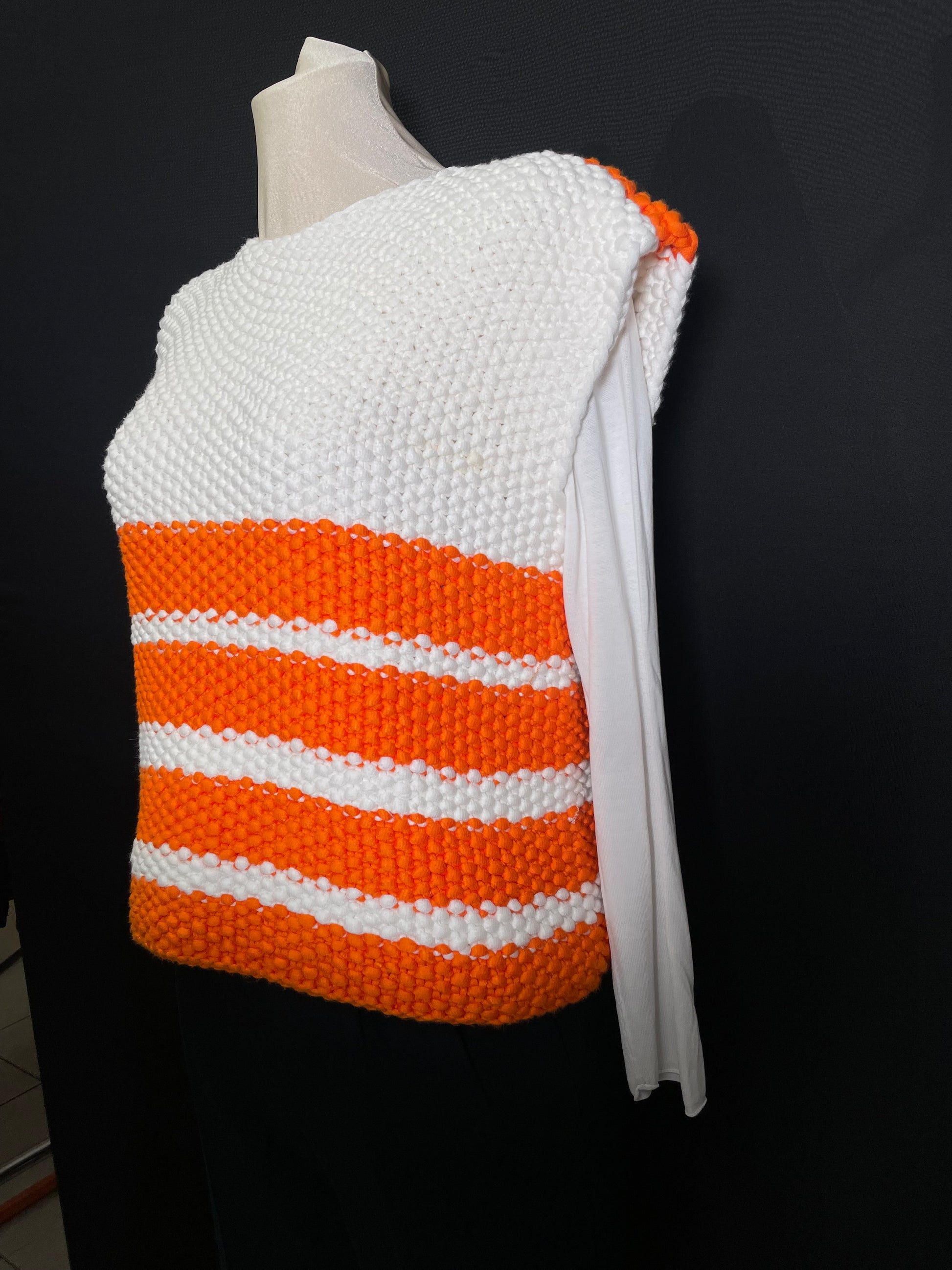 Diese orangene Weste, handgemacht und voller Persönlichkeit, ist wie ein Sonnenstrahl für deinen Kleiderschrank! Trage sie, um sicherzustellen, dass jeder sieht, wie modisch du bist – selbst wenn du gerade nur zum Kühlschrank schlenderst! Ideal, um deinen Look aufzupeppen und die gute Laune zu verbreiten!