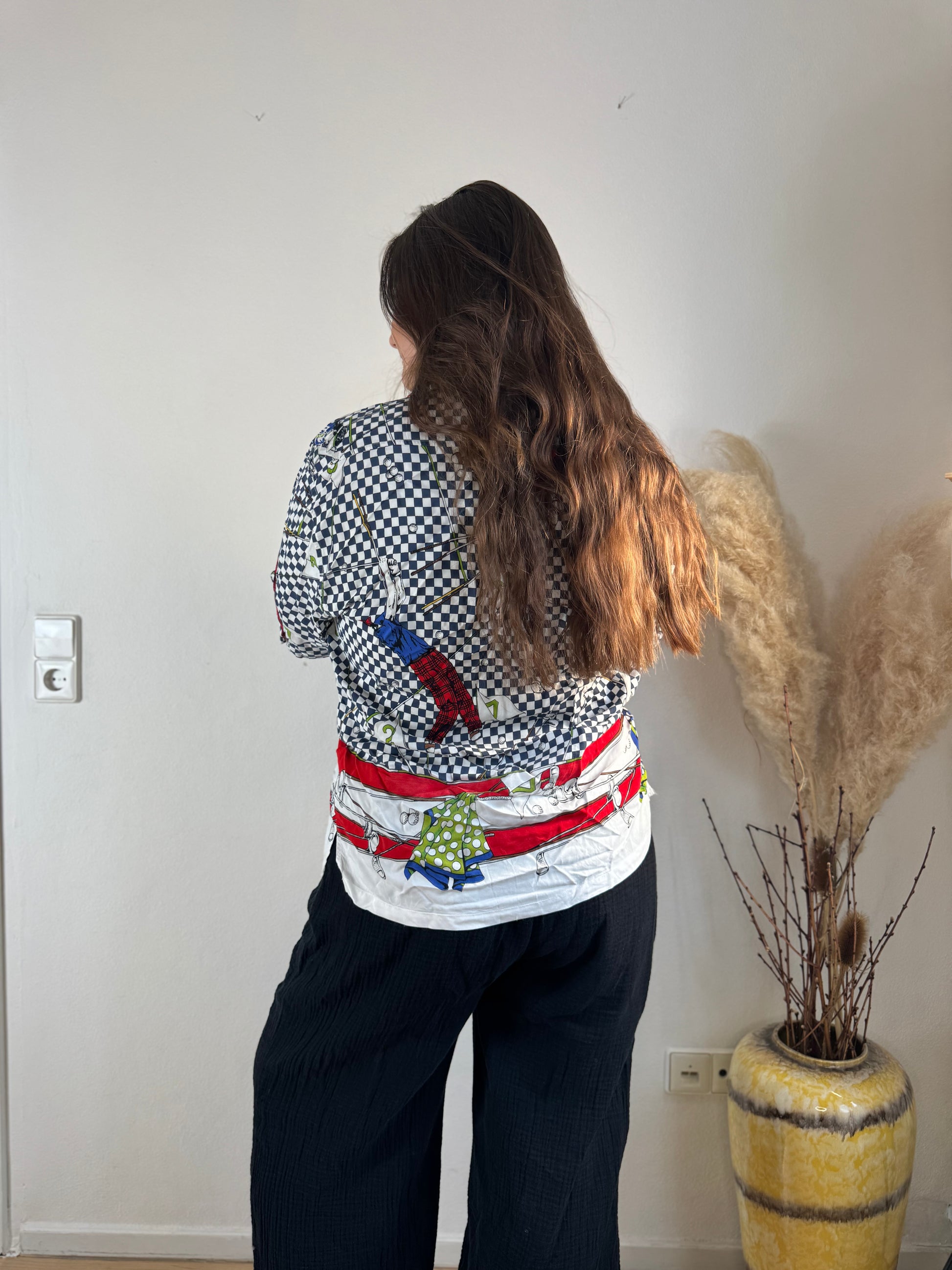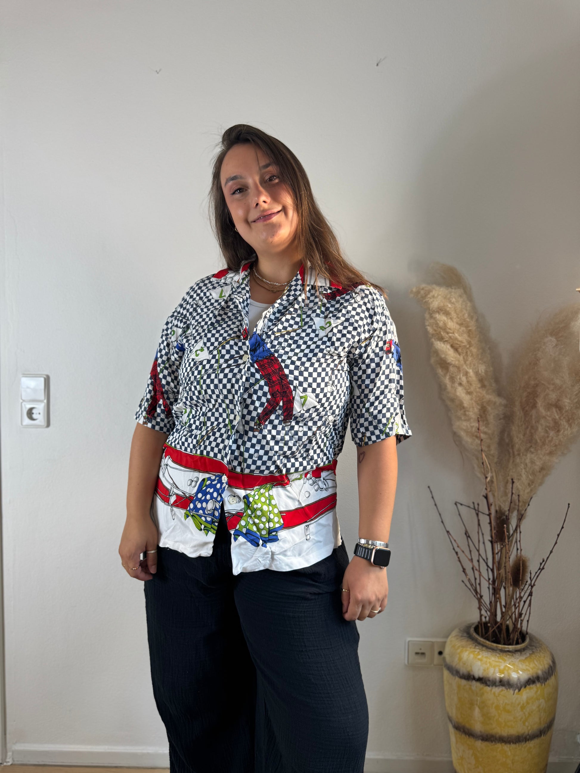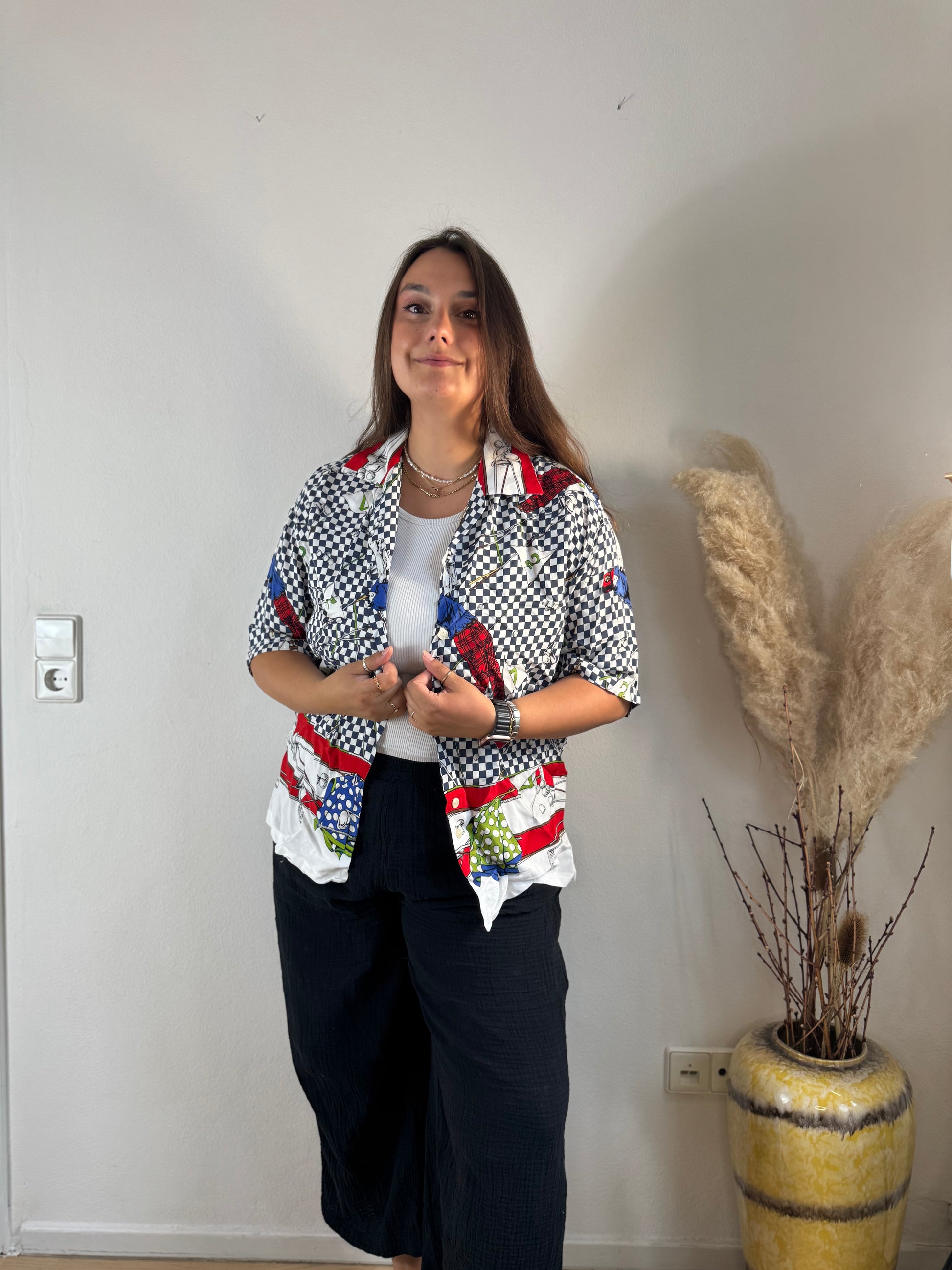Setze ein Fashion-Statement mit dieser farbenfrohen Kurzarmbluse! Der auffällige Mix aus Karo-, Chili- und Fliegenpilz-Print verleiht deinem Look eine verspielte und zugleich stylische Note. Der lockere Schnitt sorgt für ein angenehmes Tragegefühl – perfekt für warme Tage oder als Eyecatcher unter einer Jacke.