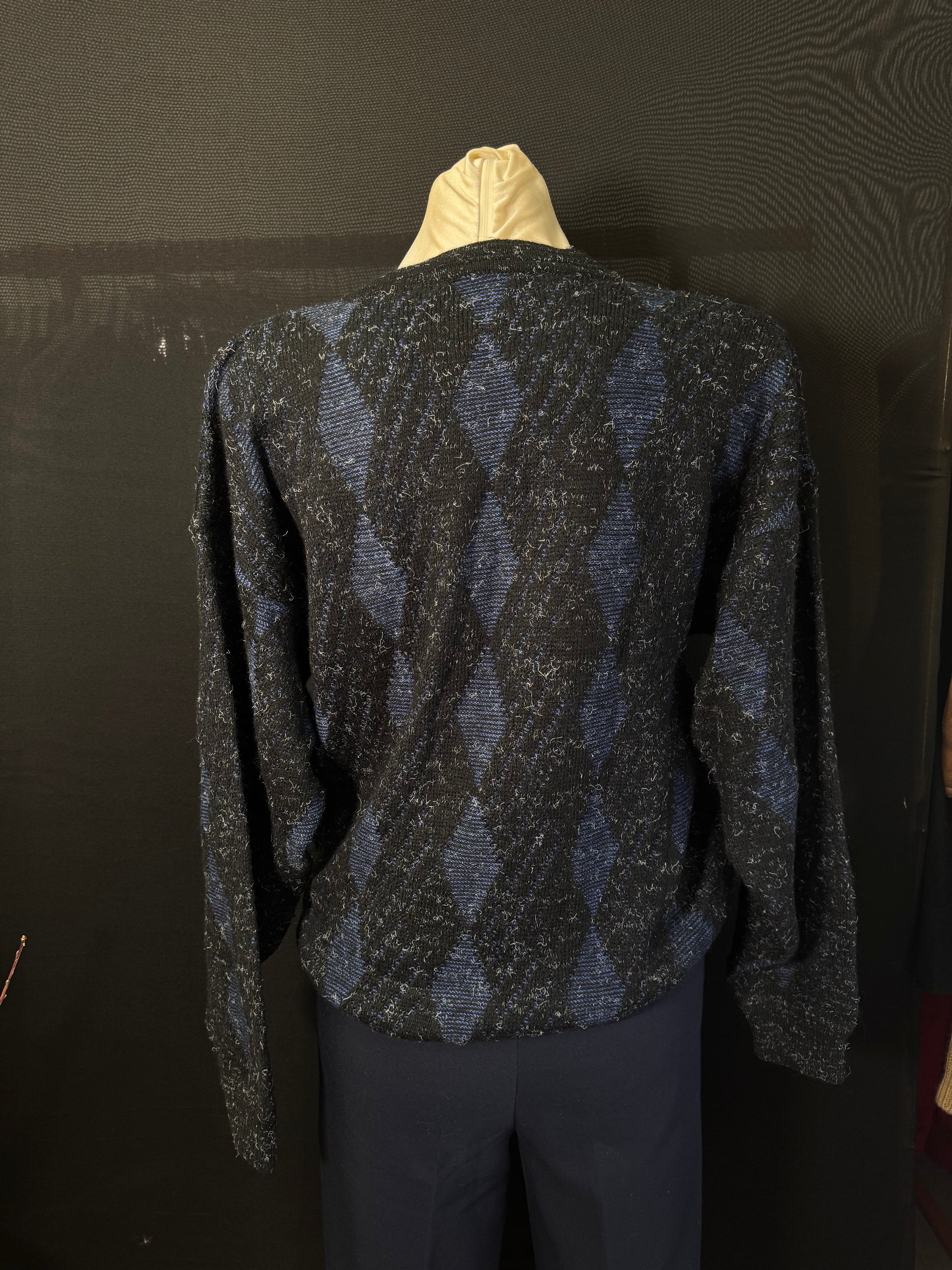 Dieser elegante Vintage-Strickpullover besticht durch sein klassisches Rautenmuster in dunklem Blau und Schwarz. Die dezenten Farbverläufe und die weiche, leicht melierte Textur verleihen dem Pullover einen stilvollen Retro-Charme.